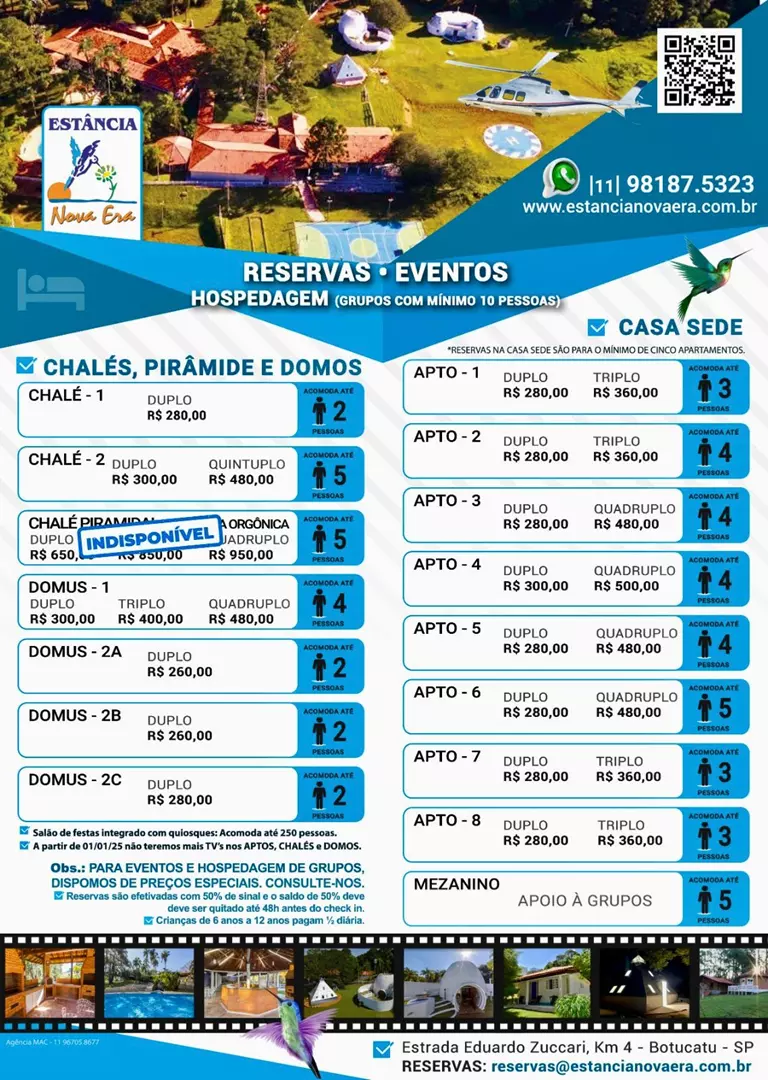 (Obs: Crianças até 5 anos é cortesia e de 6 à 12 anos paga meia diária.)